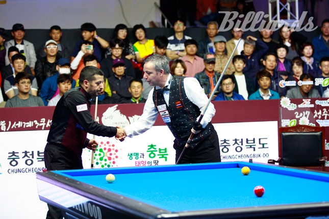 [빌리어즈=청주/김민영 기자] '2017 청주직지 3쿠션 월드컵' 준결승전 제2경기가 오후 5시에 시작되었다. 준결승전에서는 무랏 나시 초클루(터키∙세계 랭킹 9위)와 딕 야스퍼스(네덜란드∙세계 2위)가 대결했다. 경기 결과, 초클루가 야스퍼스를 14이닝 만에 40:30으로 누르고 결승에 진출했다.