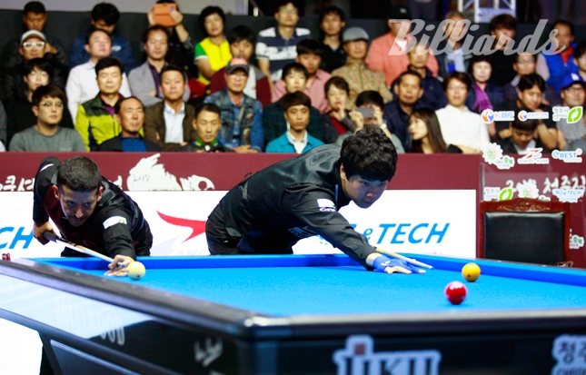 [빌리어즈=청주/김민영 기자] '2017 청주직지 3쿠션 월드컵'에서 '한국 당구의 대들보' 김행직(25∙전남당구연맹)과 터키의 월드컵 챔피언 무랏 나시 초클루(43∙세계 랭킹 9위)가 결승에서 만났다. 사진은 결승전 뱅킹 장면.