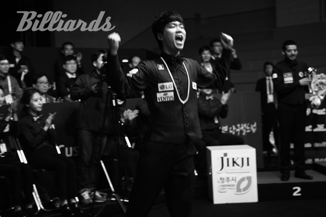 [빌리어즈=청주/김민영 기자] '2017 청주직지 3쿠션 월드컵'에서 '사대천왕'을 제외한 최초의 월드컵 2연승, 그리고 한국 선수 최초 월드컵 2연승 기록을 세운 김행직이 시상식에 입장하며 포효하고 있다.