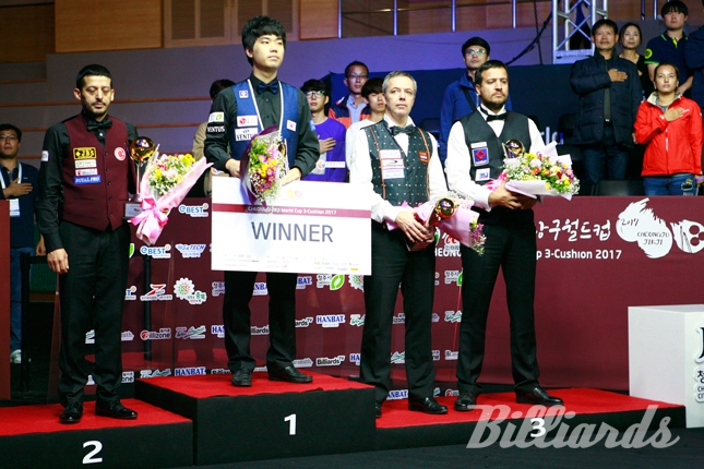 [빌리어즈=청주/김민영 기자] '2017 청주직지 3쿠션 월드컵' 시상식에서 김행직(25∙전남당구연맹)이 우승 시상대에 올라 서 있다. 김행직은 1일 오후 7시 30분에 열린 결승전에서 터키의 무랏 나시 초클루(43∙세계 랭킹 9위)를 16이닝 만에 40:30으로 꺾고 우승을 차지했다.