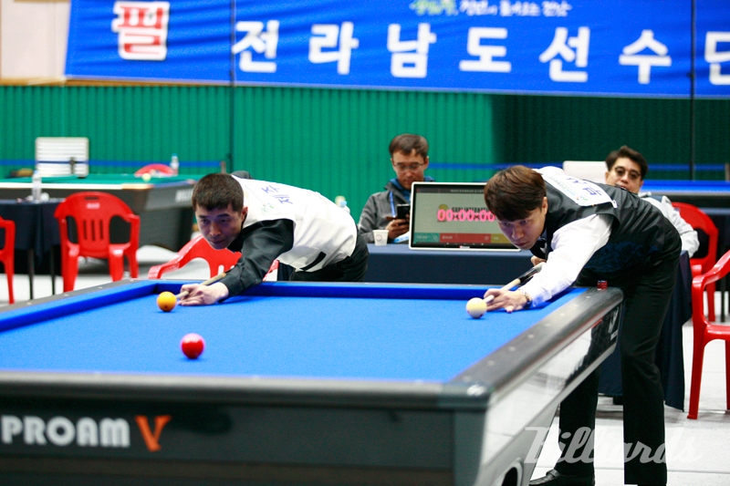 [빌리어즈=괴산/김민영 기자] '2017 전국체전' 당구 1쿠션 종목 결승전에서 김봉철(제주)과 최성원(부산)이 대결한다. 김봉철은 21일 오전 9시에 열린 준결승전에서 2015년 전국체전 1쿠션 금메달리스트 조재호(서울시청)를 100:77(18이닝)로 꺾었고, 최성원은 지난해 1쿠션 금메달리스트 허정한(경남)을 100:72(19이닝)로 누르고 결승에 올랐다. 사진은 결승전 뱅킹하는 두 선수.