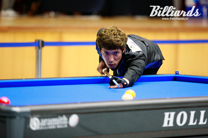 [빌리어즈=괴산/김민영 기자] 강원도 캐롬 종목 대표 김형곤(국내 랭킹 7위)이 21일 오후 4시 30분에 시작된 3쿠션 16강전에서 샷을 하고 있다. 김형곤은 39:38로 승리를 눈 앞에 둔 상황에서 강민구(충북)에게 아깝게 역전패했다.