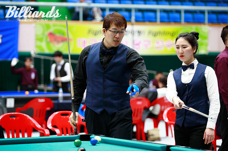 [빌리어즈=괴산/김민영 기자] '2017 전국체육대회' 당구 종목 포켓 9볼 혼성복식전 16강에 출전한 대구광역시 대표 최성욱(국내 랭킹 6위)∙진혜주(국내 4위)가 포지셔닝을 하기 위해 의논하고 있다. 지난해 전국체전에서 준우승한 대구광역시는 강원도에 5-8로 패해 탈락했다.
