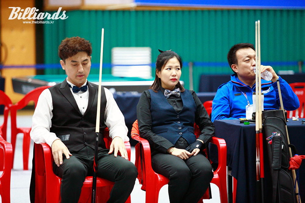 [빌리어즈=괴산/김민영 기자] '2017 전국체육대회' 당구 종목 포켓 9볼 혼성복식전 결승전이 열린 22일 오후 3시 광주광역시 고명준과 최솔잎이 자리에 앉아 경기를 준비하고 있다.