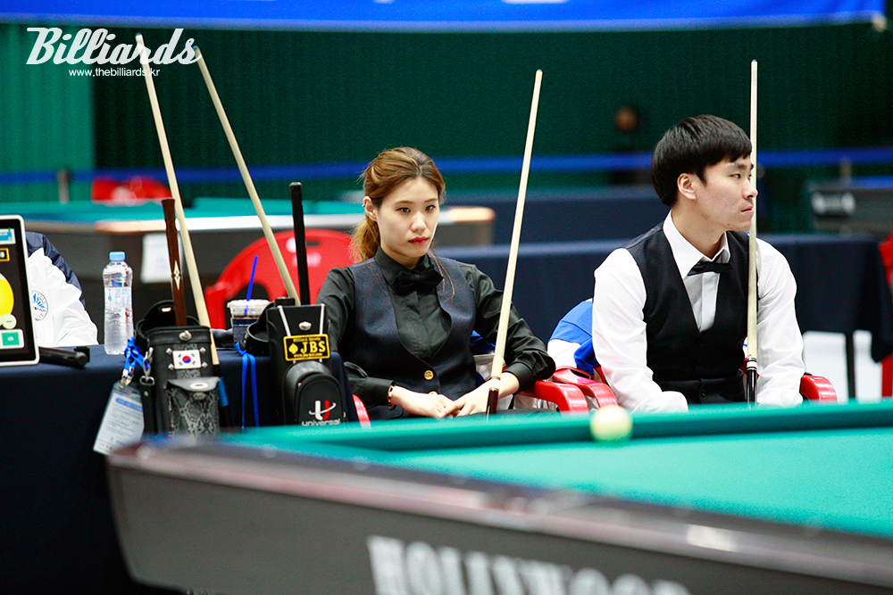 [빌리어즈=괴산/김민영 기자] '2017 전국체육대회' 당구 종목 포켓 9볼 혼성복식전에서 20대 '영 파워' 세종특별자치시의 김정현과 고태영이 결승에 진출했다. 사진은 결승에 앞서 대기 중인 두 선수.