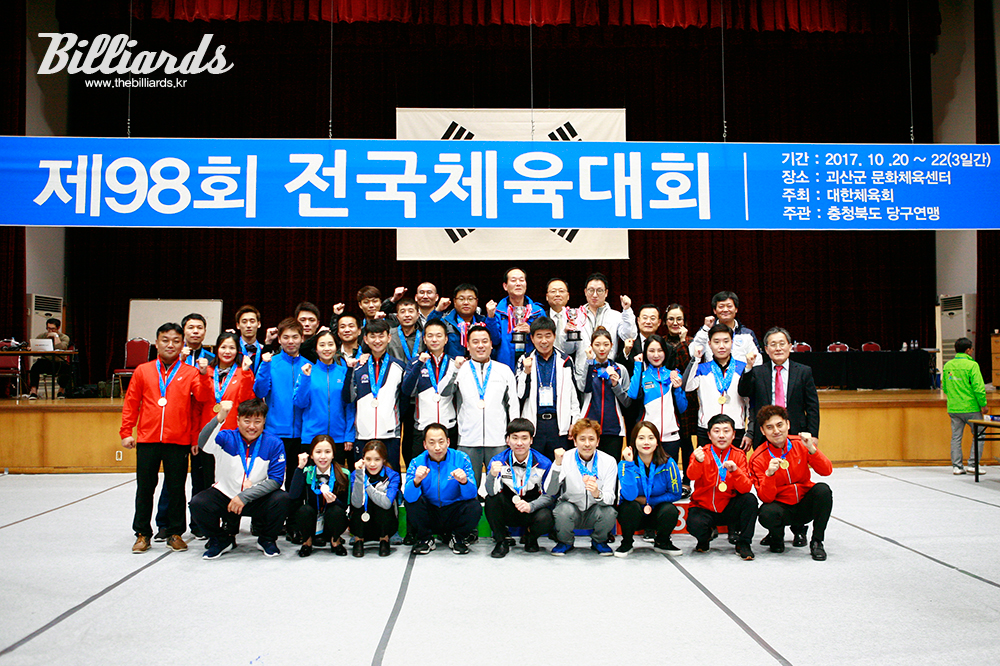 [빌리어즈=괴산/김민영 기자] '2017 제98회 전국체육대회' 정식종목인 당구 경기가 7개 세부종목으로 나뉘어 20일부터 22일까지 충북 괴산문화체육센터에서 열렸다. 광주 최솔잎은 포켓 10볼 여자부 개인전과 포켓 9볼 혼성복식전에서 금메달을 목에 걸어 2관왕에 올랐고, 전남 장문석이 포켓 10볼 남자부 금메달과 포켓 9볼 혼성복식전 동메달을 획득했다. 종합순위는 광주가 1위, 전남이 2위에 올랐다.