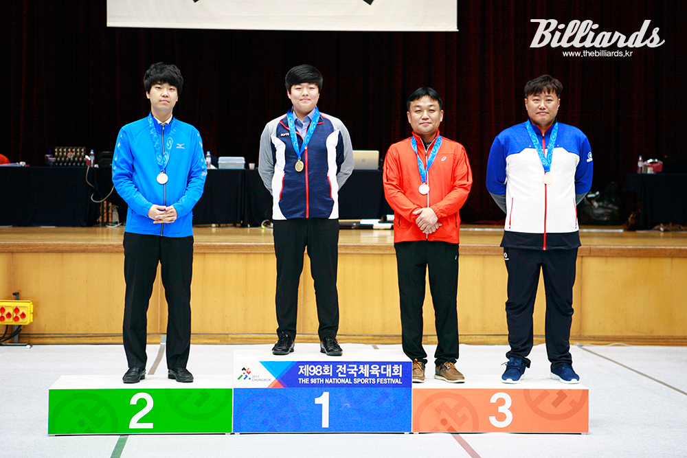 [빌리어즈=괴산/김민영 기자] 22일 오후 5시 '2017 제98회 전국체육대회' 당구 종목 시상식이 열렸다. 사진은 캐롬 3쿠션 입상자들(우승 조명우, 준우승 김행직, 공동 3위 김현석∙구민수).