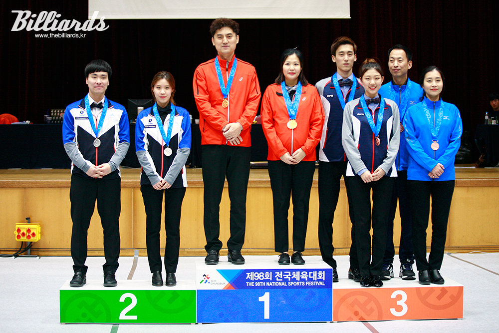 [빌리어즈=괴산/김민영 기자] 22일 오후 5시 '2017 제98회 전국체육대회' 당구 종목 시상식이 열렸다. 사진은 포켓 9볼 혼성복식전 입상자들(우승 광주, 준우승 세종, 공동 3위 경기∙전남).