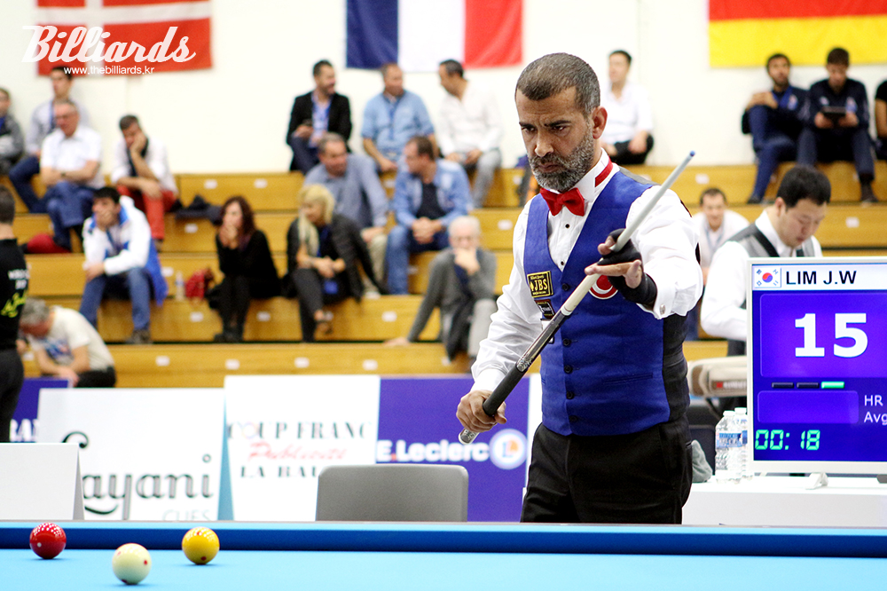 [빌리어즈=라볼/장한얼 기자] 세계 랭킹이 17위까지 떨어진 '터키 태풍' 타이푼 타스데미르가 26일 열린 라볼 3쿠션 당구월드컵 최종예선 Q라운드에 출전했다. 타스데미르는 첫 경기에서 한국의 임정완(서울)과 대결해 40:23(28이닝)으로 승리했다.