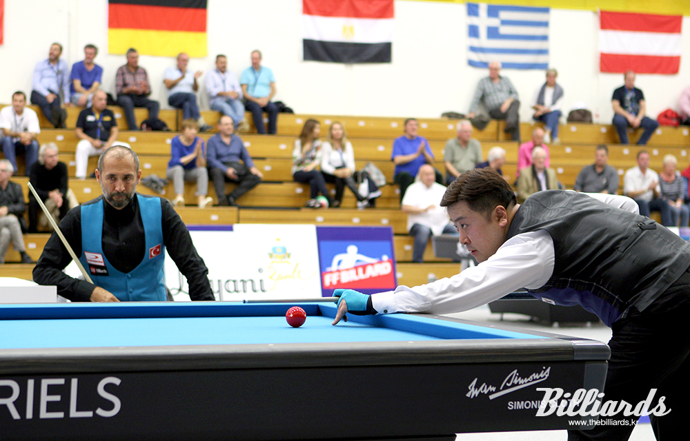 [빌리어즈=라볼/장한얼 기자] '2017 라볼 3쿠션 당구월드컵' 최종예선전에서 한국의 조치연(서울)이 터키의 3쿠션 황태자 세미 사이그너(세계 랭킹 19위)를 21이닝 만에 40:31로 누르고 조 1위로 32명이 겨루는 본선 토너먼트에 진출했다.