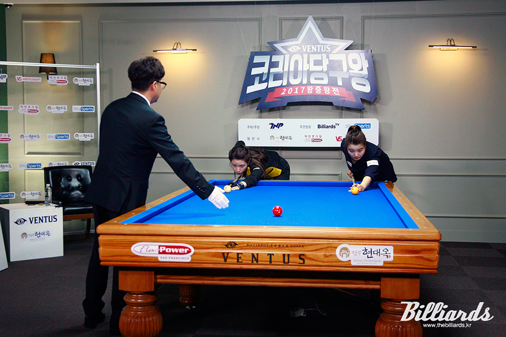 [빌리어즈=서울/김민영 기자] 아마추어 당구대회 사상 최고 규모로 개최된 '2017 벤투스컵 코리아 당구왕 왕중왕전'이 개최되었다. 27일 열린 3쿠션 여자부 결승전에서는 전애린이 김보송을 16:14로 꺾고 우승을 차지했다. 사진은 결승전 뱅킹.