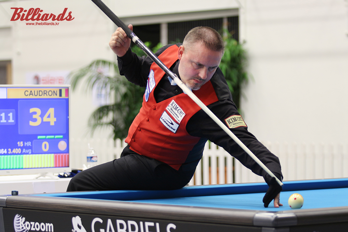 [빌리어즈=라볼/장한얼 기자] '2017 라볼 3쿠션 당구월드컵' 16강전에서 프레데릭 쿠드롱(벨기에∙세계 랭킹 7위)이 연속 15득점 하이런에 힘입어 12이닝 만에 40:28로 네덜란드 장 폴 더 브라윈을 꺾고 8강에 진출했다. 쿠드롱은 올해 2월 터키 부르사 월드컵 우승 이후 네 번의 월드컵에서 16강 이상 올라가지 못했다.