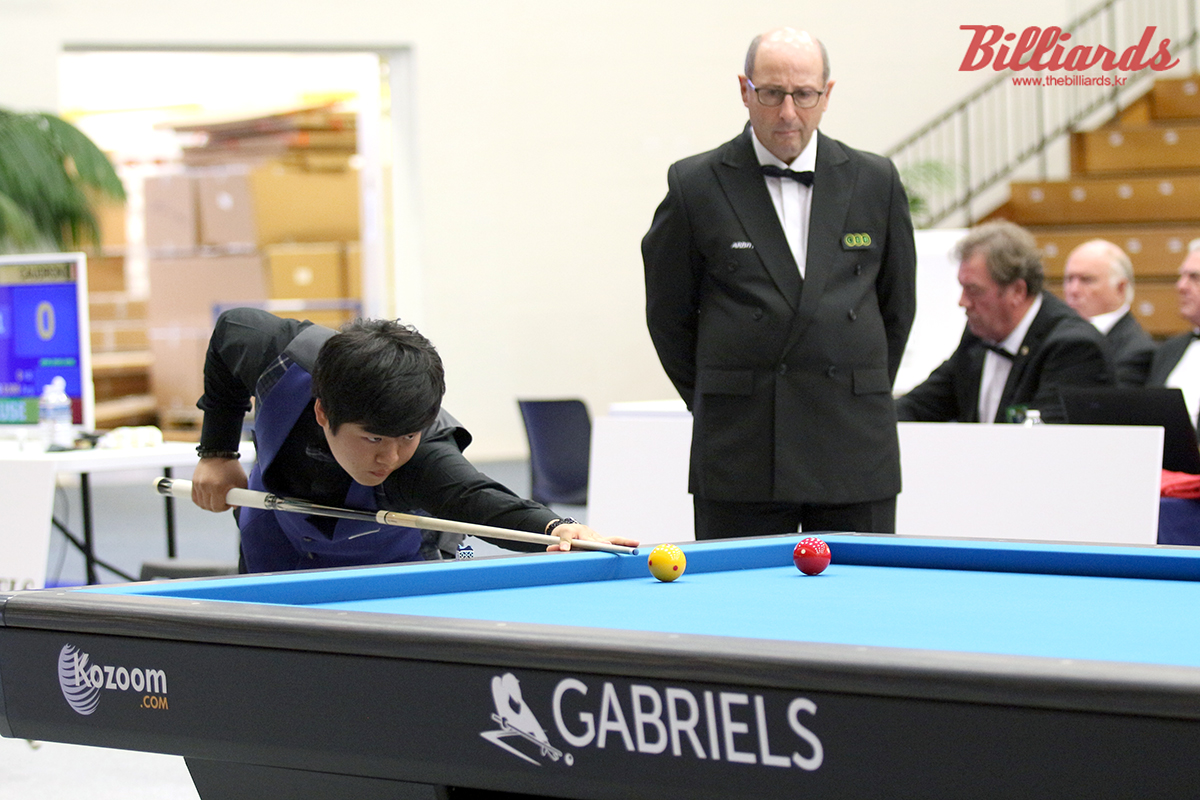 [빌리어즈=라볼/장한얼 기자] '리틀 파워' 19살 조명우(한체대∙세계 랭킹 21위)가 이번 시즌 당구월드컵 두 번째 4강에 진출했다. 조명우는 한국시간으로 29일 오전 1시에 열린 '2017 라볼 3쿠션 당구월드컵' 8강전에서 세계 랭킹 14위의 강타자 쩐뀌엣치엔(베트남)을 21이닝 만에 40:32로 꺾었다. 조명우는 준결승전에서 '3쿠션 사대천왕' 프레데릭 쿠드롱(벨기에∙세계 7위)과 대결한다.