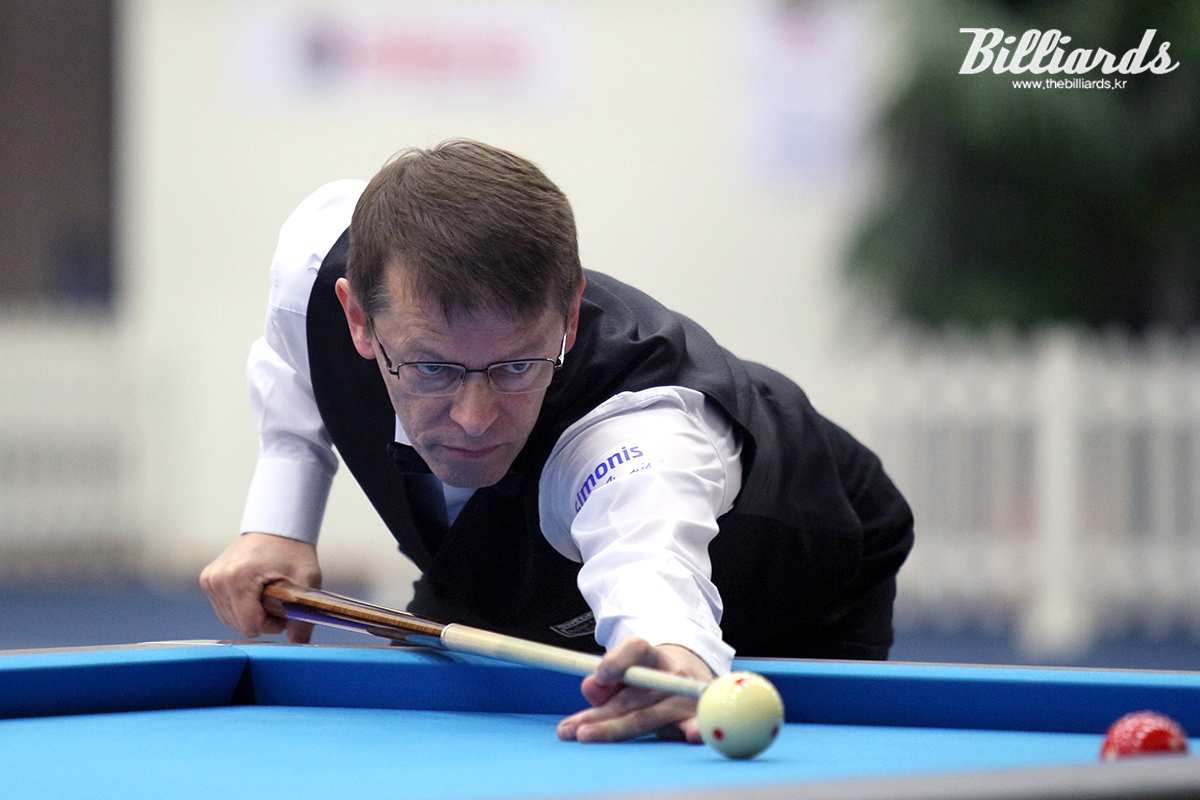[빌리어즈=라볼/장한얼 기자] 한국시간으로 30일 밤 12시에 시작된 '2017 라볼 3쿠션 당구월드컵' 결승전에서 토브욘 블롬달(스웨덴)이 8이닝 만에 21:15로 프레데릭 쿠드롱에게 앞선 가운데 전반전이 끝났다. 블롬달은 1987년 벨기에 안트워프 당구월드컵에서 처음 우승을 차지한 이후 30년 동안 43번 월드컵 우승을 차지했다. 이번 월드컵 결승전은 블롬달의 63번째 월드컵 결승전이다.
