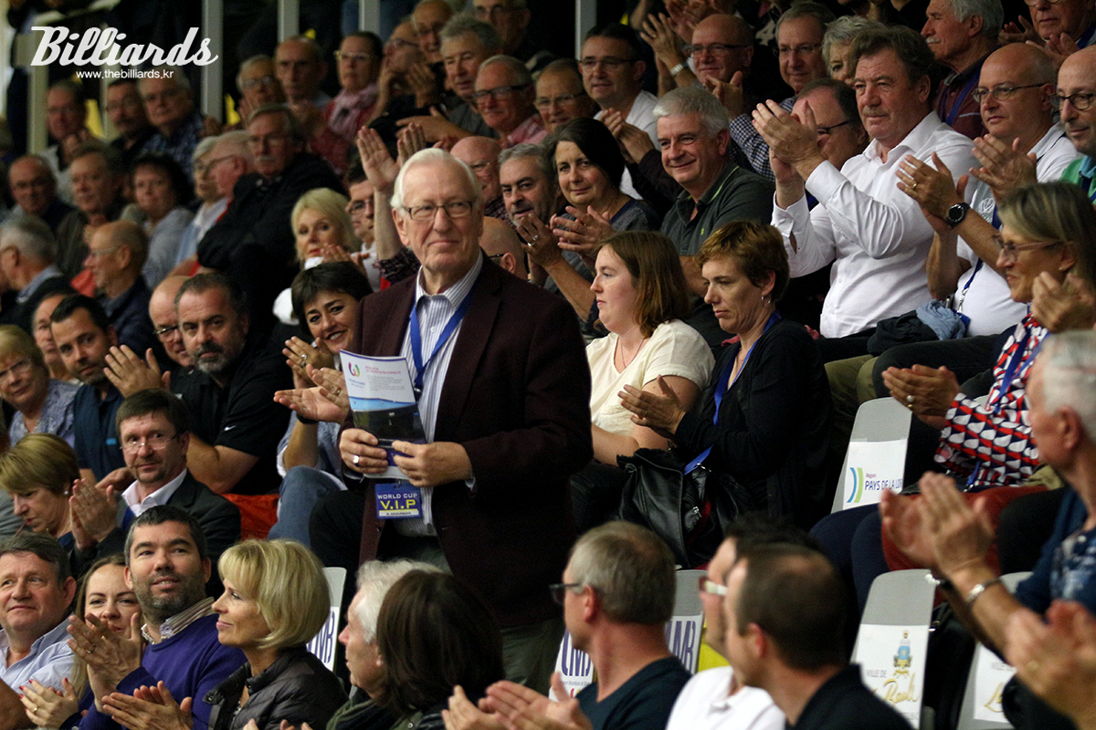 [빌리어즈=라볼/장한얼 기자] '살아있는 당구 전설' 레이몽 클루망(80∙벨기에)이 '2017 라볼 3쿠션 당구월드컵' 결승전에 앞서 사회자로부터 관중들에게 소개를 받고 있다. 클루망은 이번 대회를 직접 관전하며 후배 선수들을 격려했다. 사진은 <빌리어즈> 잡지를 손에 들고 관중들에게 인사하는 클루망.