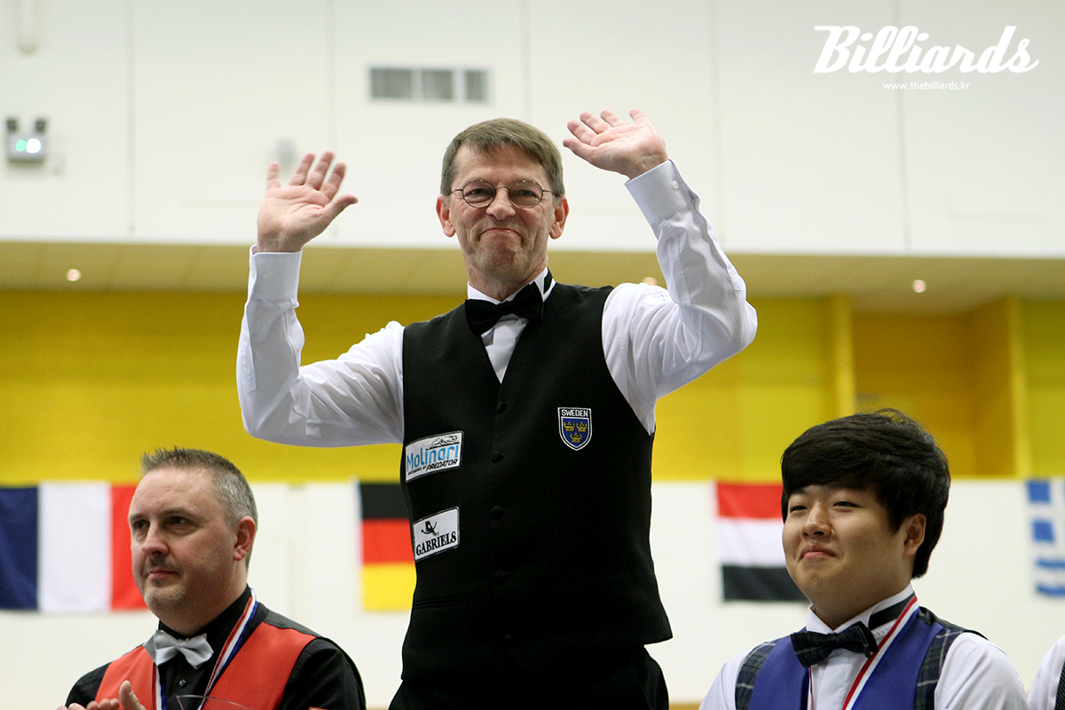 [빌리어즈=라볼/장한얼 기자] '2017 라볼 3쿠션 당구월드컵'에서 개인 통산 44번째 월드컵 우승을 차지한 토브욘 블롬달(스웨덴)이 시상식에서 손을 흔들고 있다. 블롬달은 한국시간 30일 자정에 열린 결승전에서 프레데릭 쿠드롱을 17이닝 만에 40:25로 꺾고 우승을 차지했다.