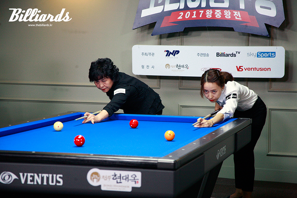 [빌리어즈=서울/김민영 기자] 29일 벤투스캐롬클럽에서 열린 '2017 벤투스컵 코리아 당구왕 왕중왕전' 4구 여자부 결승전에서 박종분과 안세영이 뱅킹을 하고 있다. 박종분은 23이닝 만에 38:24로 안세영을 꺾고 2년 연속 왕중왕에 올랐다.