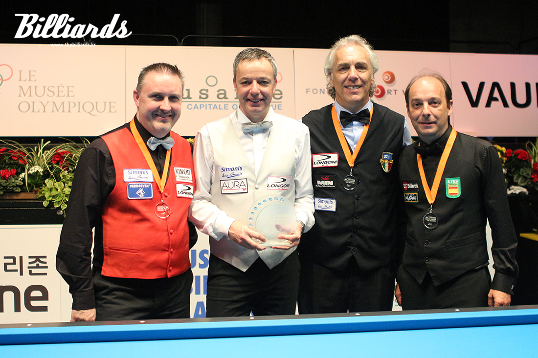 [빌리어즈=로잔/김민영 기자] 세계 랭킹 2위 딕 야스퍼스(네덜란드)가 '2017 로잔 빌리어드 마스터스'에서 우승을 차지했다. 야스퍼스는 한국시간으로 19일 오후 10시 30분에 시작된 결승전에서 '2017년 3쿠션 당구 세계 챔피언' 프레데릭 쿠드롱(벨기에∙세계 1위)을 16이닝 만에 40:24로 꺾고 2015년에 이어 두 번째 로잔 마스터스 우승을 차지했다.