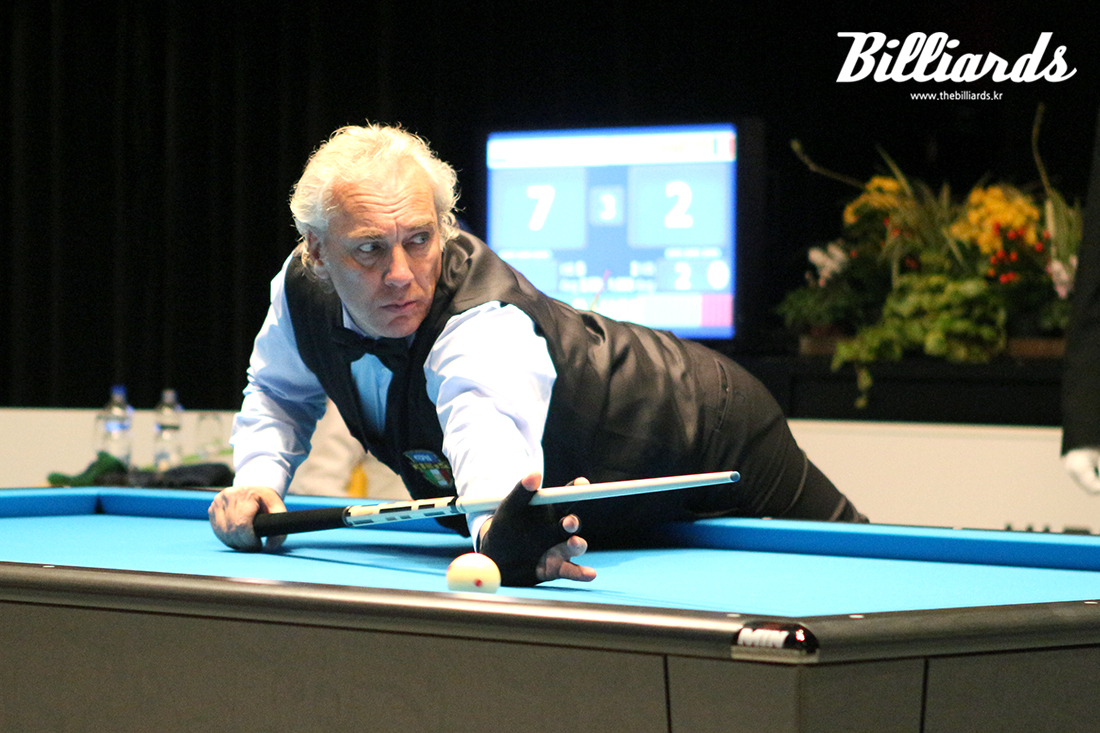 [빌리어즈=로잔/김민영 기자] 이탈리아의 당구 거장 마르코 자네티(세계 랭킹 5위)가 딕 야스퍼스(네덜란드∙세계 2위)와의 준결승전에서 샷을 하고 있다. 자네티는 이번 대회 8강전에서 8이닝 만에 40점을 마무리하며 애버리지 5.00 기록을 남겼다. 8강에서 제러미 뷰리(프랑스)를 40:8로 꺾은 자네티는 준결승전에서 우승자 야스퍼스에게 15:40(18이닝)으로 패해 공동 3위로 대회를 마감했다.