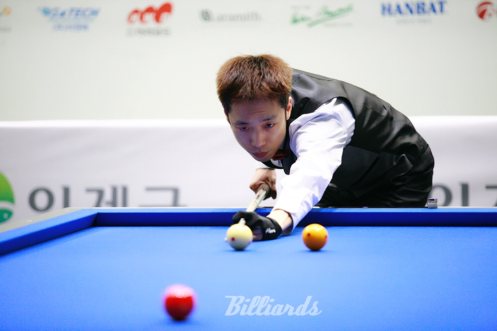 [빌리어즈=인제/김민영 기자]“인제 돌풍”을 일으키며 준결승에 오른 박인수(서울)가 강동궁과 첫 준결승전 경기를 치르고 있다.