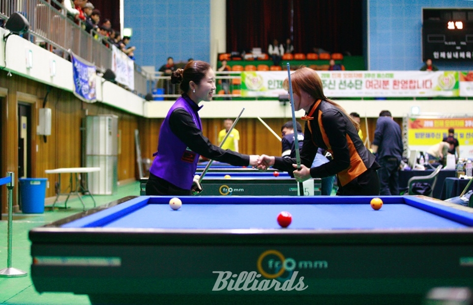 [빌리어즈=인제/김민영 기자] ‘2018 인제 오미자배 3쿠션 페스티벌’의 여자부 첫 준결승전에 앞서 김갑선이 김보미와 악수를 나누며 인사를 하고 있다.