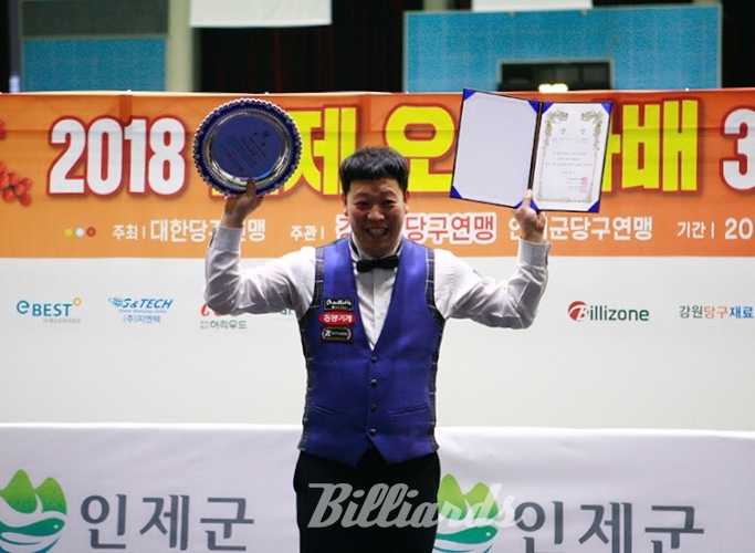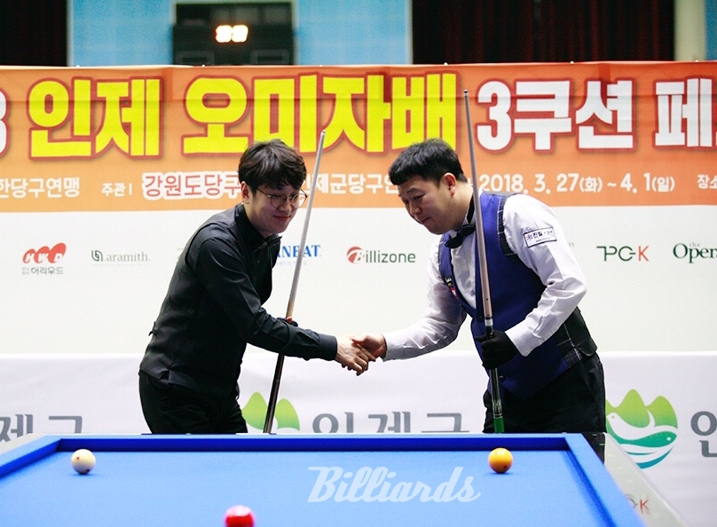 [빌리어즈=인제/김민영 기자] 강동궁(동양기계)이 ‘2018 인제 오미자배 3쿠션 페스티벌’ 결승전에서 완벽한 수비와 몰아치는 공격력으로 오성욱(서울)을 압도하며 승리를 거두었다.