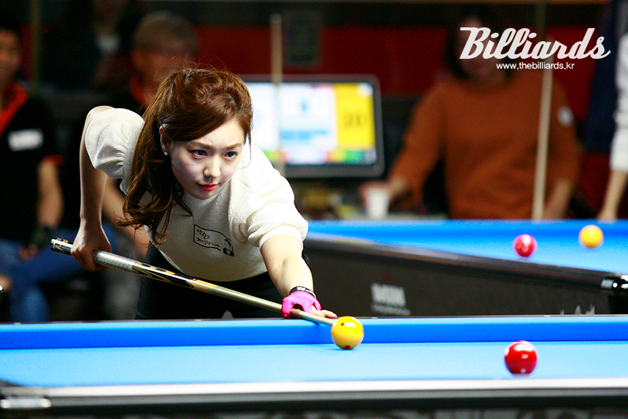 [빌리어즈=서울/김민영 기자] '당구 여신' 한주희가 '2018 제3회 김경률 추모배 클럽팀3쿠션당구대회'에 출전했다. 사진은 한주희가 오전 10시에 서울 강남 SL당구클럽에서 열린 예선 첫 경기에서 신중하게 스트로크를 하고 있다.