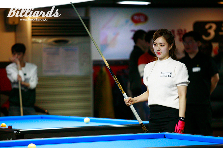 [빌리어즈=서울/김민영 기자] '2018 제3회 김경률 추모배 클럽팀3쿠션당구대회'에 참가한 한주희가 오전 10시 시작된 예선 첫 경기에 출전했다. 사진은 예선 첫 경기에서 득점을 확인하는 한주희.