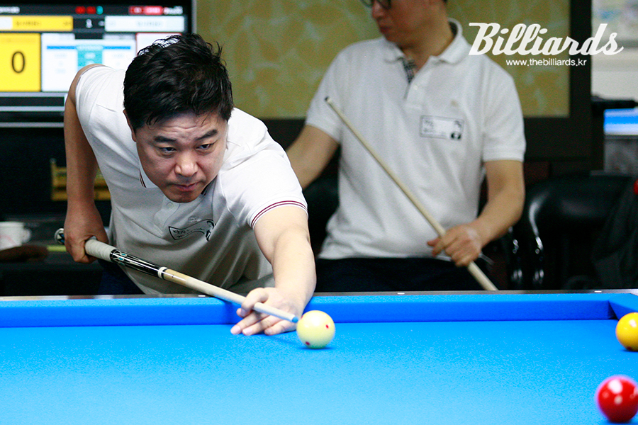 [빌리어즈=서울/김민영 기자] '2018 제3회 김경률 추모배 클럽팀3쿠션당구대회'에 참가한 '뽀로로 아빠' 김일호 오콘 대표이사가 오전 11시 30분에 열린 예선 첫 경기에서 신중하게 샷을 하고 있다.