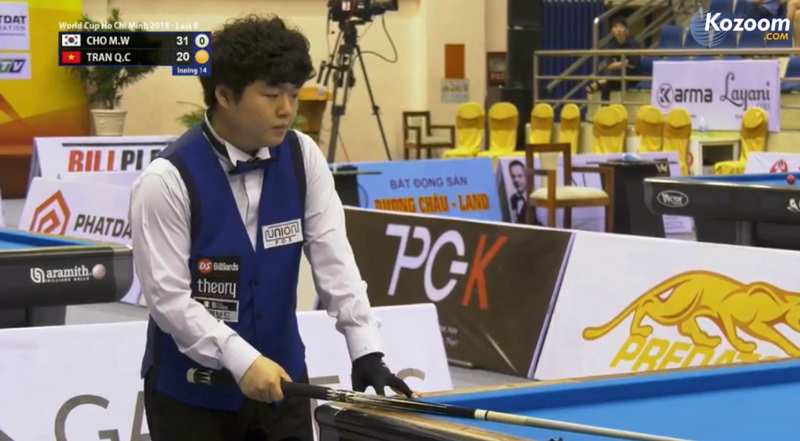한국시간으로 26일 오후 7시에 시작된 '2018 호찌민 3쿠션 당구월드컵' 8강전에서 조명우는 홈 팬들의 열렬한 응원을 받은 쩐뀌엣찌엔에게 19이닝 만에 35:40으로 역전패 당했다.