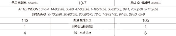 13프레임에서도 47점과 25점을 친 트럼프가 7-6으로 따라붙었고, 14프레임에서는 142점 센추리 브레이크를 기록하며 5,000파운드의 보너스까지 덤으로 챙겼다(7-7).