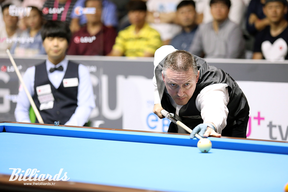 7일 오후 3시에 시작된 '2018 LG유플러스컵 3쿠션 마스터스' 준결승전에서 쿠드롱은 폭발적인 득점포를 앞세워 완승을 거두었다.