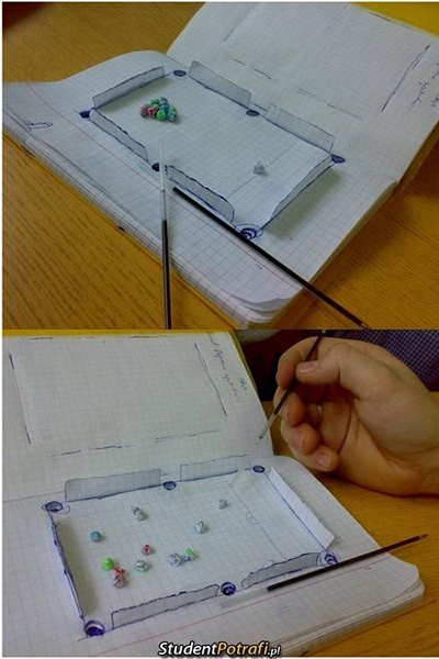 만드는 것도 어렵지 않다. 종이 두 장을 겹쳐서 포켓볼 당구대처럼 6개의 구멍을 뚫고 레일처럼 종이를 세우면 된다.