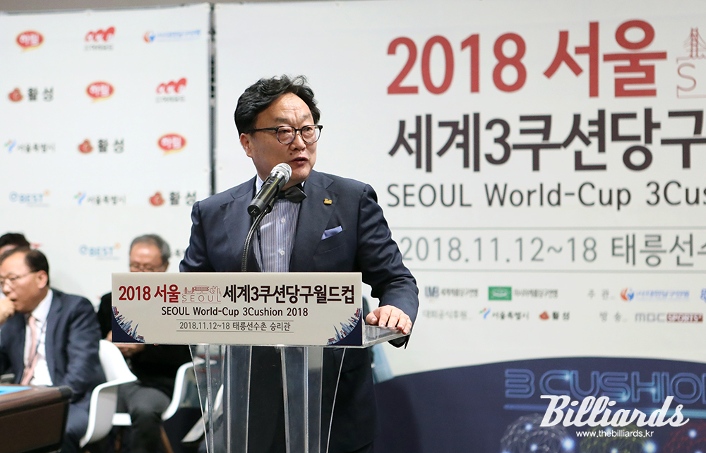 [빌리어즈=태릉선수촌/김민영 기자] 19년 만에 서울에서 '3쿠션 당구월드컵' 개최에 성공한 서울당구연맹 류석 회장이 16일 오후 4시에 태릉선수촌 승리관에서 열린 2018 서울 3쿠션 당구월드컵 개회식에서 축사를 하고 있다.