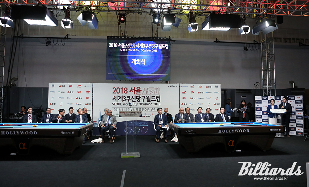 [빌리어즈=태릉선수촌/김민영 기자] 19년 만에 서울에서 열린 '2018 서울 3쿠션 당구월드컵' 개회식이 16일 오후 4시에 태릉선수촌 승리관에서 열렸다.