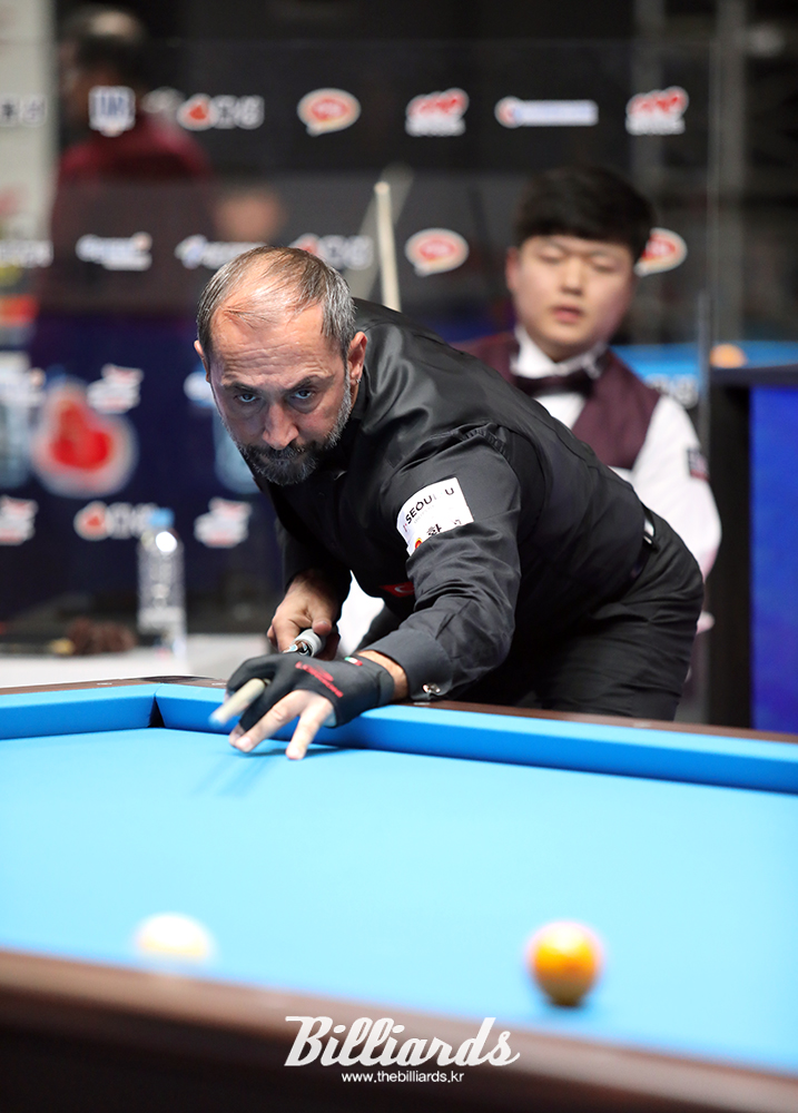 [빌리어즈=태릉선수촌/김민영 기자] 승승장구하던 세미 사이그너(터키·세계랭킹 3위)가 '2018 서울 3쿠션 당구월드컵' 32강전에서 한국의 조명우(실크로드시앤티)에게 패하며 탈락했다. 사이그너는 경기 막판에 38:38로 동점까지 추격했지만, 22이닝 타석에서 종이 한 장 차이로 득점에 실패하며 조명우에게 기회를 넘겨주었고, 결국 패해 아쉽게 큐를 접었다.