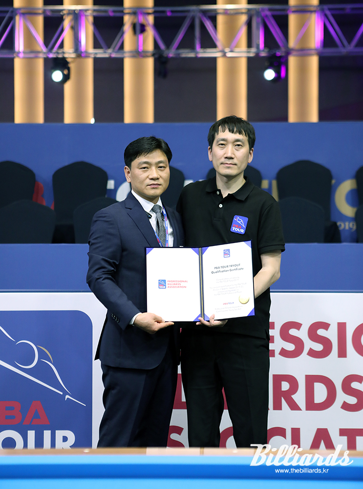 사진은 1부 투어 프로당구선수 자격을 획득한 선수 출신 김경민과 안진환 PBA 심판위원장.