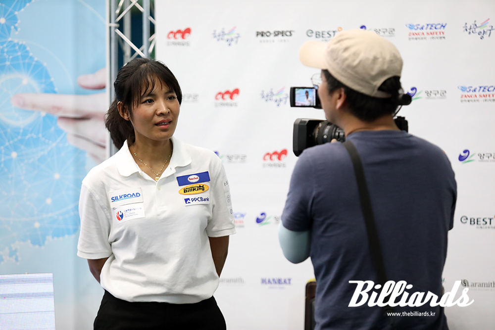 [빌리어즈=김민영 기자] '국토정중앙배 2019 전국당구대회'에서 공동 3위를 차지한 스롱 피아비(서울)가 시상식에 앞서 촬영 중인 KBS 다큐멘터리 프로그램과 아쉬운 소감을 전하고 있다.